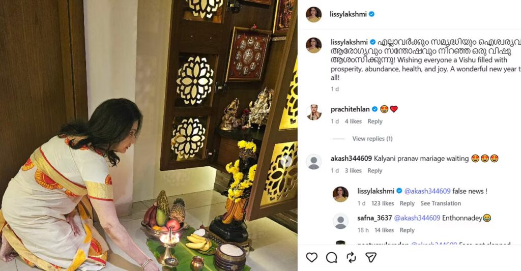 എന്നാൽ, കാട്ടുതീ പോലെ പടർന്ന ഈ അഭ്യൂഹങ്ങൾക്ക് ഇപ്പോൾ കൃത്യമായ ഒരു മറുപടി നൽകിയിരിക്കുകയാണ് പ്രശസ്ത നടിയും കല്യാണിയുടെ അമ്മയുമായ ലിസി ലക്ഷ്മി. കഴിഞ്ഞ വിഷു ദിനത്തിൽ ലിസി തന്റെ സോഷ്യൽ മീഡിയ അക്കൗണ്ടിൽ ഒരു ആശംസ പങ്കുവെച്ചിരുന്നു. “എല്ലാവർക്കും സമൃദ്ധിയും ഐശ്വര്യവും ആരോഗ്യവും സന്തോഷവും നിറഞ്ഞ ഒരു വിഷു, പുതുവത്സര ആശംസകൾ!” എന്നായിരുന്നു ആ പോസ്റ്റ്. ഈ പോസ്റ്റിന് താഴെ ഒരു ആരാധകൻ കല്യാണിയും പ്രണവും തമ്മിലുള്ള വിവാഹത്തിനായി കാത്തിരിക്കുന്നു എന്ന് കമന്റ് ചെയ്തു. യാതൊരു മടിയും കൂടാതെ ലിസി അതിന് നൽകിയ മറുപടി ഇതായിരുന്നു: “ഇതൊരു തികച്ചും തെറ്റായ വാർത്തയാണ്.” ഈ ഒറ്റ വരിയിലൂടെ എല്ലാ വ്യാജ വാർത്തകൾക്കും അവർ വിരാമമിട്ടു. അനാവശ്യമായി ഇത്തരം ചോദ്യങ്ങൾ ചോദിച്ച വ്യക്തിയെ മറ്റ് പലരും കമന്റ് ബോക്സിൽ പരിഹസിക്കുകയും ചെയ്തു.