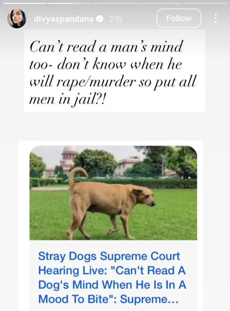 ഇന്ത്യയിലെ തെരുവുനായ ശല്യം എന്നും അവസാനിക്കാത്ത ഒരു തർക്കവിഷയമാണ്. ഒരു വശത്ത് പേപ്പട്ടി ശല്യത്തെക്കുറിച്ചുള്ള ഭീതി, മറുവശത്ത് മിണ്ടാപ്രാണികളുടെ അവകാശങ്ങൾ. ഈ വിഷയത്തിൽ സുപ്രീം കോടതിയിൽ നടന്ന ഒരു വാദപ്രതിവാദവും അതിനോട് പ്രശസ്ത തെന്നിന്ത്യൻ നടിയും രാഷ്ട്രീയ പ്രവർത്തകയുമായ ദിവ്യ സ്പന്ദന (രമ്യ) നടത്തിയ പ്രതികരണവുമാണ് ഇപ്പോൾ സോഷ്യൽ മീഡിയയിലെ ചൂടേറിയ ചർച്ച.