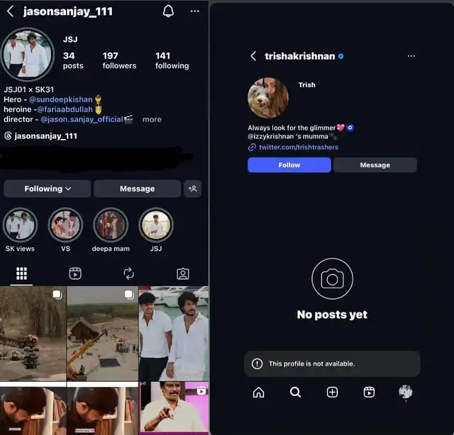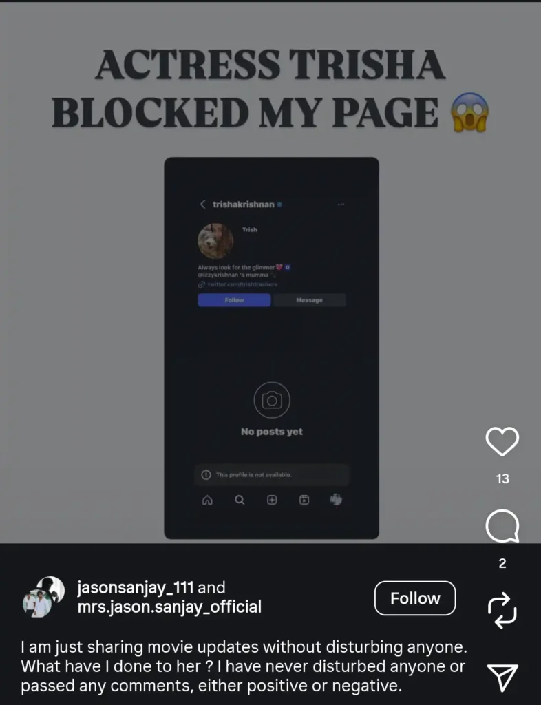 വെറും 200-ൽ താഴെ ഫോളോവേഴ്സ് മാത്രമുള്ള ഒരു ചെറിയ ഫാൻ പേജാണിത്. ജേസൺ സഞ്ജയുടെ ആദ്യ സംവിധാന സംരംഭത്തെക്കുറിച്ചുള്ള വിശേഷങ്ങൾക്കൊപ്പം, വിജയുടെയും സംഗീതയുടെയും മനോഹരമായ പഴയ കുടുംബചിത്രങ്ങളും ഈ പേജിൽ പതിവായി പ്രത്യക്ഷപ്പെട്ടിരുന്നു. “എന്തിനാണ് തൃഷ മാം എന്നെ ബ്ലോക്ക് ചെയ്തതെന്ന് അറിയില്ല. ഇത് ജേസൺ സഞ്ജയുടെ ഒരു ചെറിയ ഫാൻ പേജ് മാത്രമാണ്” എന്ന് പേജിന്റെ അഡ്മിൻ തന്നെ സ്ക്രീൻഷോട്ട് സഹിതം പുറത്തുവിട്ടതോടെയാണ് സംഭവം ചർച്ചയായത്. വിരോധാഭാസമെന്ന് പറയട്ടെ, തൃഷയും സംഗീതയും ഒരുമിച്ചുള്ള ഒരു പഴയ ചിത്രവും ഈ പേജിലുണ്ടായിരുന്നു.