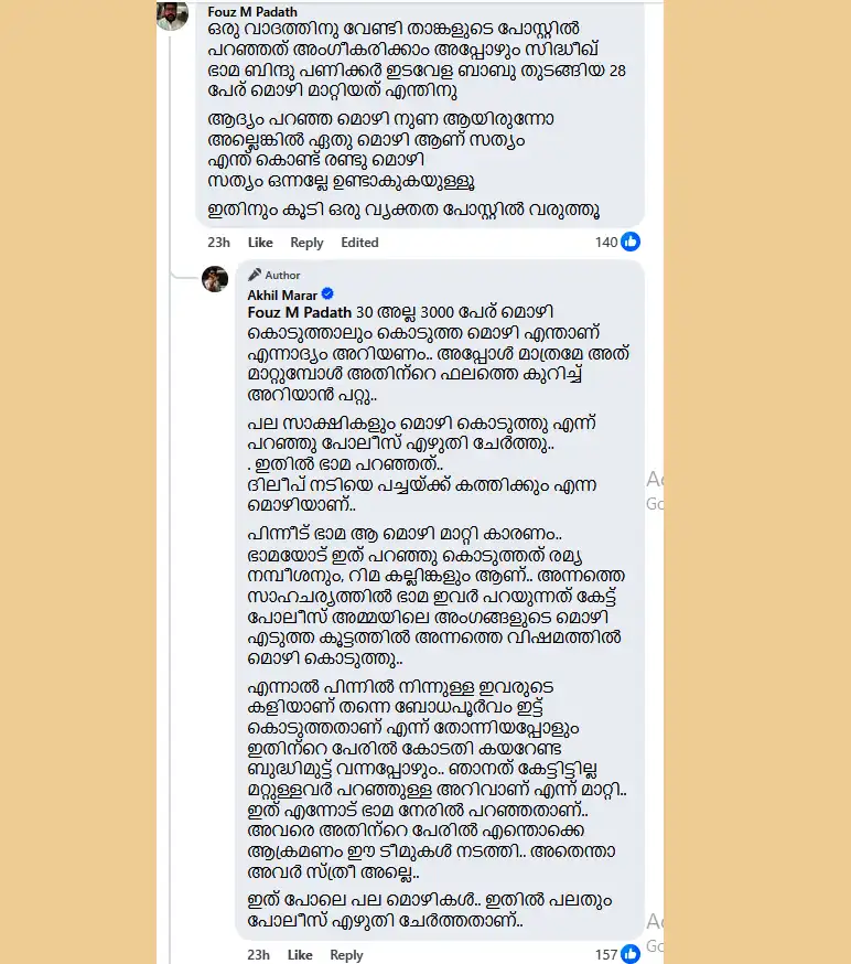 അഖിലിന്റെ പോസ്റ്റിന് താഴെ ഒരാൾ ചോദിച്ച പ്രസക്തമായ ചോദ്യത്തിന് അദ്ദേഹം നൽകിയ മറുപടിയാണ് ഇപ്പോൾ കൂടുതൽ ശ്രദ്ധേയമാകുന്നത്. “ഒരു വാദത്തിനു വേണ്ടി താങ്കളുടെ പോസ്റ്റിൽ പറഞ്ഞത് അംഗീകരിക്കാം അപ്പോഴും സിദ്ധീഖ് ഭാമ ബിന്ദു പണിക്കർ ഇടവേള ബാബു തുടങ്ങിയ 28 പേര് മൊഴി മാറ്റിയത് എന്തിനു