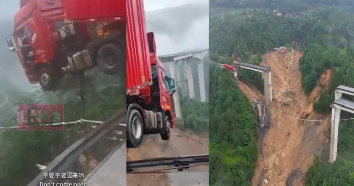 ചൈനയിലെ ഗുയിഷോ പ്രവിശ്യയിൽ കനത്ത മഴയെത്തുടർന്നുണ്ടായ മണ്ണിടിച്ചിലിൽ ഹൈവേ പാലം തകർന്നു. ഈ അപകടത്തിൽ ഒരു ട്രക്ക് പാലത്തിന്റെ തകർന്ന ഭാഗത്ത് നിന്ന് താഴേക്ക് തൂങ്ങിക്കിടക്കുകയും ഡ്രൈവർ അതിനുള്ളിൽ കുടുങ്ങുകയും ചെയ്തതിന്റെ ഭയാനകമായ ദൃശ്യങ്ങൾ സമൂഹമാധ്യമങ്ങളിൽ വൈറലായി. ഡ്രൈവർ അത്ഭുതകരമായി രക്ഷപ്പെട്ടുവെന്നാണ് റിപ്പോർട്ടുകൾ.