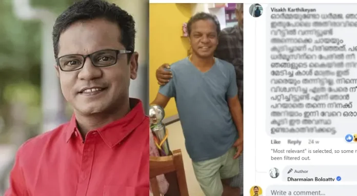 ഒരാൾ ധർമജൻ തന്നെ പറ്റിച്ചു എന്ന് തരത്തിൽ ഒരു പോസ്റ്റ് പങ്ക് വച്ചിരുന്നു. വൈശാഖൻ കാർത്തികേയൻ എന്ൻ ഫേസ് ബുക്ക് ഐഡിയിൽ നിന്നാണ് കമെന്റ് വന്നത്. നിന്റെ വീട്ടിൽ വന്നു ചായയൊക്കെ ഞാനും കുടിച്ചിട്ട് അന്ന് നീ ധർമൂസിന്റെ പേരിൽ ഞങ്ങടെ കയ്യിൽ നിന്ന് വാങ്ങിയ ക്യാഷ് ഇന്ന് വരെ തിരിച്ചു നൽകിയിട്ടില്ല എന്നും അയാൾ ആരോപിക്കുന്നുണ്ട് . നിന്നെ വിശ്വസിച്ച എത്ര പേരെ നീ പറ്റിച്ചിട്ടുണ്ട് എന്ന് ഞാൻ പറയാതെ തന്നെ നിനക്ക് അറിയാം മറ്റൊരാൾക്കും ഈ അവസ്ഥ വരാതിരിക്കട്ടെ എന്ന് പറഞ്ഞു കൊണ്ടാണ് അയാൾ തന്റെ പോസ്റ്റ് അവസാനിപ്പിക്കുന്നത്.