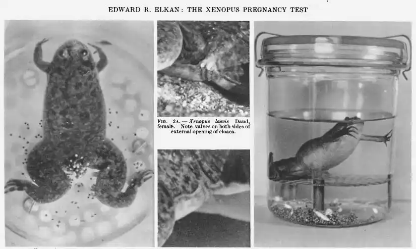 1930, 1931 കാലഘട്ടങ്ങളിൽ ലാൻസലോട്ട് ഹോഗ്ബെൻ എന്ന ശാസ്ത്രജ്ഞനാണ് ഈ പ്രതിഭാസം ആദ്യമായി ലോകത്തിന് മുന്നിൽ അവതരിപ്പിച്ചത്. പിന്നീട് 1938-ൽ ഡോ. എഡ്വേർഡ് ആർ. എൽകാൻ എന്ന ഡോക്ടർ ബ്രിട്ടീഷ് മെഡിക്കൽ ജേർണലിൽ ഈ പരിശോധനയെക്കുറിച്ച് വിശദമായി എഴുതി. അദ്ദേഹം ഇതിന് ‘സെനോപസ് പ്രഗ്നൻസി ടെസ്റ്റ്’ (xenopus pregnancy test) എന്ന് പേരിട്ടു. അദ്ദേഹം നടത്തിയ 295 പരിശോധനകളിൽ 2,112 തവളകളെ ഉപയോഗിച്ചുവെന്നും, അതിൽ ഗർഭധാരണം സ്ഥിരീകരിച്ച ഒരൊറ്റ ഫലം പോലും തെറ്റിയിട്ടില്ലെന്നും അദ്ദേഹം വ്യക്തമാക്കിയിരുന്നു. രണ്ടാഴ്ചയ്ക്ക് ശേഷം വീണ്ടും പരിശോധിച്ചപ്പോഴും ഫലം കൃത്യമായിരുന്നു.