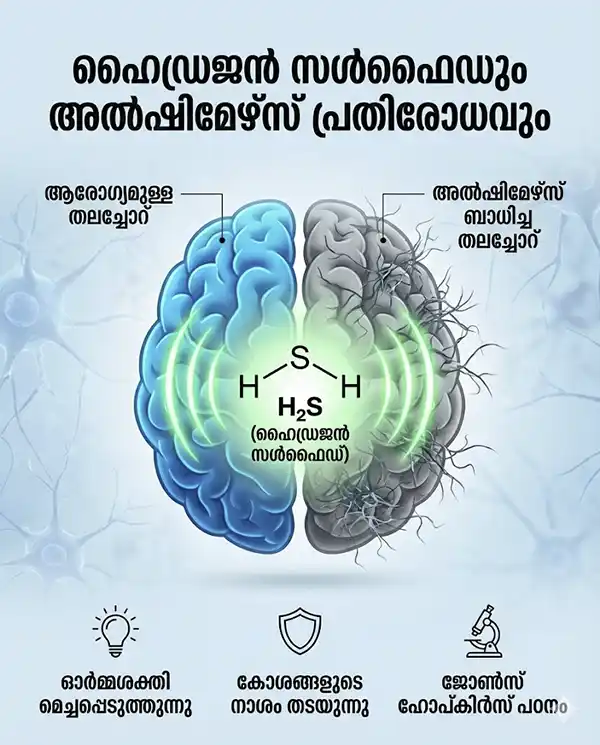 അൽഷിമേഴ്സ് രോഗികളിൽ തലച്ചോറിലെ കോശങ്ങൾ നശിച്ചുപോകുന്നതാണ് ഓർമ്മക്കുറവിനും വിഭ്രാന്തിക്കും കാരണമാകുന്നത്. ഇവിടെ വില്ലനാകുന്നത് ‘ഗ്ലൈക്കോജൻ സിന്തേസ് ബീറ്റ’ (GSK3β) എന്നൊരു എൻസൈം ആണ്. അമിതമായി പ്രവർത്തിക്കുന്ന ഈ എൻസൈമിനെ നിയന്ത്രിക്കാൻ സൾഫർ അടങ്ങിയ ഹൈഡ്രജൻ സൾഫൈഡിന് കഴിയുമെന്ന് പഠനം തെളിയിക്കുന്നു. ലളിതമായി പറഞ്ഞാൽ, തലച്ചോറിലെ കോശങ്ങളെ നശിക്കാതെ കാത്തുസൂക്ഷിക്കാൻ ഈ “ഗന്ധവായു”വിന് കഴിയും.