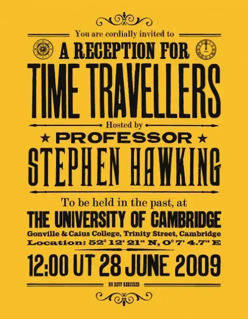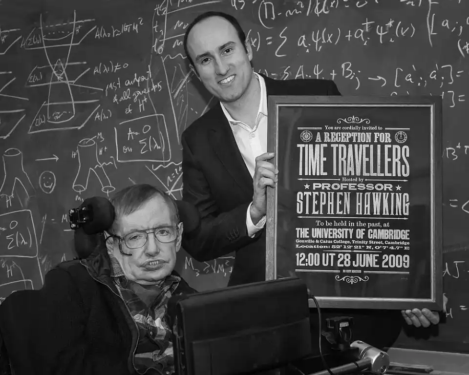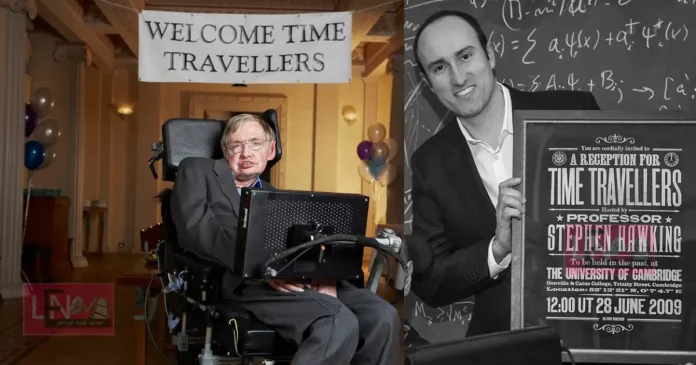 2009 ജൂൺ 28-നായിരുന്നു സംഭവം. കേംബ്രിഡ്ജ് സർവ്വകലാശാലയിലെ ഗോൺവില്ലെ ആൻഡ് കയസ് കോളേജിലെ ഒരു മുറിയിൽ സ്റ്റീഫൻ ഹോക്കിംഗ് ഒരു ഗംഭീര വിരുന്ന് ഒരുക്കി. ഷാംപെയ്ൻ കുപ്പികൾ, വർണ്ണാഭമായ ബലൂണുകൾ, സ്വാദിഷ്ടമായ ഭക്ഷണം – എല്ലാം തയ്യാർ. പക്ഷേ, ഒരു കുഴപ്പമുണ്ടായിരുന്നു. പാർട്ടി ഹാളിൽ ഹോക്കിംഗ് മാത്രം! അതിഥികളായി ആരുമില്ല.