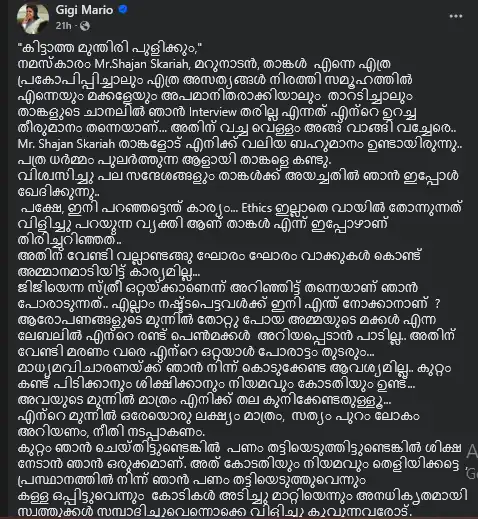 മറുനാടൻ മലയാളി എഡിറ്റർ ഷാജൻ സ്കറിയയെ പേരെടുത്തു പറഞ്ഞുകൊണ്ടാണ് ജിജിയുടെ വിമർശനം. തന്നെ എത്രയൊക്കെ പ്രകോപിപ്പിച്ചാലും, സമൂഹത്തിന് മുന്നിൽ എത്രയൊക്കെ താറടിച്ചു കാണിച്ചാലും ഷാജന്റെ ചാനലിന് ഇന്റർവ്യൂ നൽകില്ലെന്നത് തന്റെ ഉറച്ച തീരുമാനമാണെന്ന് ജിജി വ്യക്തമാക്കി. “അതിന് വെച്ച വെള്ളം അങ്ങ് വാങ്ങി വെച്ചേരെ,” എന്ന പരിഹാസവും അവർ ഉയർത്തുന്നുണ്ട്.