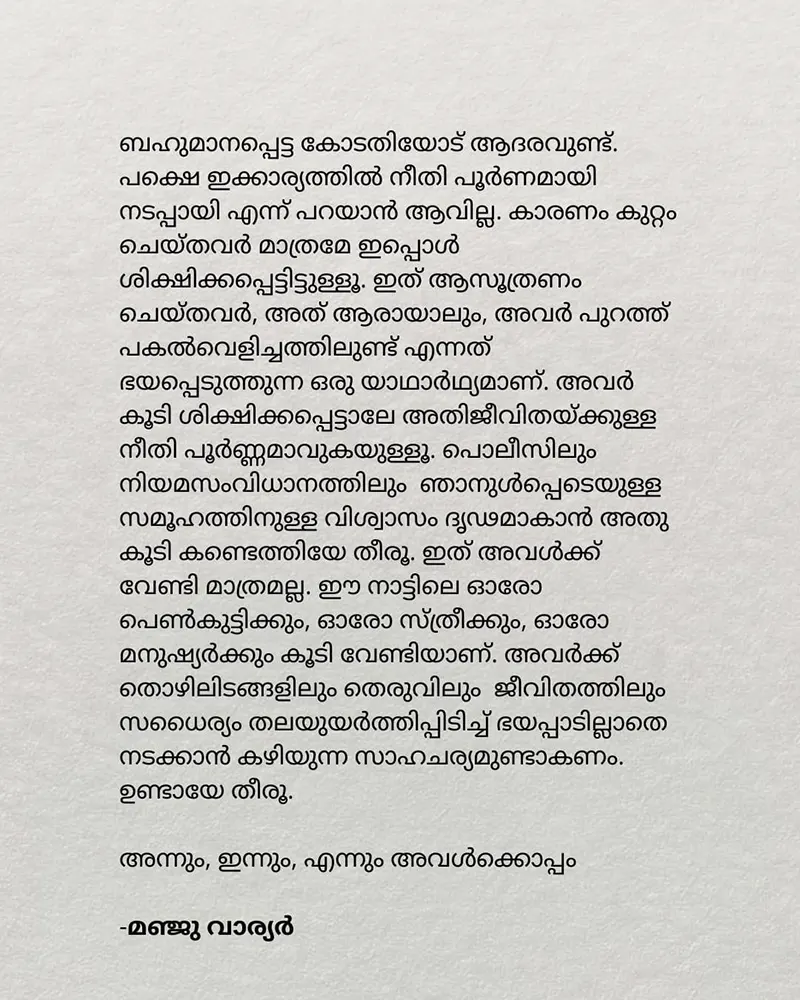 2017-ൽ ഈ സംഭവം നടന്നത് മുതൽ “അവൾക്കൊപ്പം” (Avalkkoppam) എന്ന ഹാഷ്ടാഗുമായി അതിജീവിതയ്ക്ക് താങ്ങായി നിന്നവരിൽ പ്രധാനിയാണ് മഞ്ജു വാര്യർ. കേസിലെ പ്രധാന സാക്ഷികളിൽ ഒരാളായിട്ടും, പല സമ്മർദ്ദങ്ങൾ ഉണ്ടായിട്ടും സത്യത്തിനൊപ്പം നിൽക്കാൻ അവർ കാണിച്ച ധൈര്യം പ്രശംസനീയമാണ്. “അന്നും, ഇന്നും, എന്നും അവൾക്കൊപ്പം” എന്ന് പറഞ്ഞുകൊണ്ടാണ് മഞ്ജു തന്റെ കുറിപ്പ് അവസാനിപ്പിക്കുന്നത്.