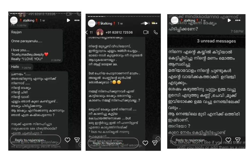 വെറും ശല്യപ്പെടുത്തലല്ല, ജീവന് ഭീഷണിയുള്ള സന്ദേശങ്ങളാണ് റെയ്ജന് ലഭിക്കുന്നതെന്നും മൃദുല തെളിവ് സഹിതം പറയുന്നു. “‘നീ എന്നെ മൈൻഡ് ചെയ്തില്ലെങ്കിൽ ഞാൻ നിന്റെ തലയിൽ ബിയർ കുപ്പി വെച്ച് അടിച്ചു പൊട്ടിക്കും’ എന്ന തരത്തിലാണ് ഭീഷണി. ഇന്ന് ഡയറി മിൽക്കുമായി പർദ്ദയിട്ട് ലൊക്കേഷനിൽ വരാൻ അവർക്ക് കഴിഞ്ഞെങ്കിൽ, നാളെ ഒരു ആസിഡ് മുഖത്ത് ഒഴിക്കാനും അവർ മടിക്കില്ല.”