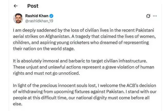 “അടുത്തിടെ പാകിസ്ഥാൻ നടത്തിയ വ്യോമാക്രമണത്തിൽ സാധാരണക്കാർ കൊല്ലപ്പെട്ടതിൽ ഞാൻ അതീവ ദുഃഖിതനാണ്. സ്ത്രീകളും കുട്ടികളും, ലോകവേദിയിൽ തങ്ങളുടെ രാജ്യത്തെ പ്രതിനിധീകരിക്കാൻ സ്വപ്നം കണ്ട യുവ ക്രിക്കറ്റ് താരങ്ങളും ആ ദുരന്തത്തിൽ ഇരകളായി. സാധാരണക്കാരെ ലക്ഷ്യമിടുന്നത് തികച്ചും അധാർമ്മികവും പ്രാകൃതവുമാണ്. ഇത് മനുഷ്യാവകാശങ്ങളുടെ നഗ്നമായ ലംഘനമാണ്,” റാഷിദ് ഖാൻ കുറിച്ചു.