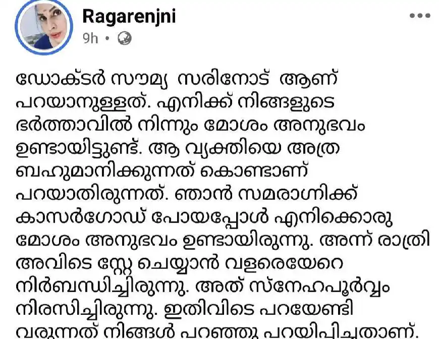 സൗമ്യയുടെ ഈ പോസ്റ്റ് ചർച്ചയാകുന്നതിനിടയിലാണ് അപ്രതീക്ഷിതമായി അടുത്ത ആരോപണം ഉയർന്നുവന്നത്. കോൺഗ്രസ് അനുഭാവിയും ട്രാൻസ്ജെൻഡർ ആക്ടിവിസ്റ്റുമായ രാഗരഞ്ജിനി, സൗമ്യയെ അഭിസംബോധന ചെയ്തുകൊണ്ട് ഒരു ഫേസ്ബുക്ക് പോസ്റ്റിട്ടു. അതിന്റെ ഉള്ളടക്കം ഇതായിരുന്നു: “സൗമ്യ സരിൻ, നിങ്ങളുടെ ഭർത്താവിൽ നിന്ന് എനിക്ക് മോശം അനുഭവം ഉണ്ടായിട്ടുണ്ട്.”
