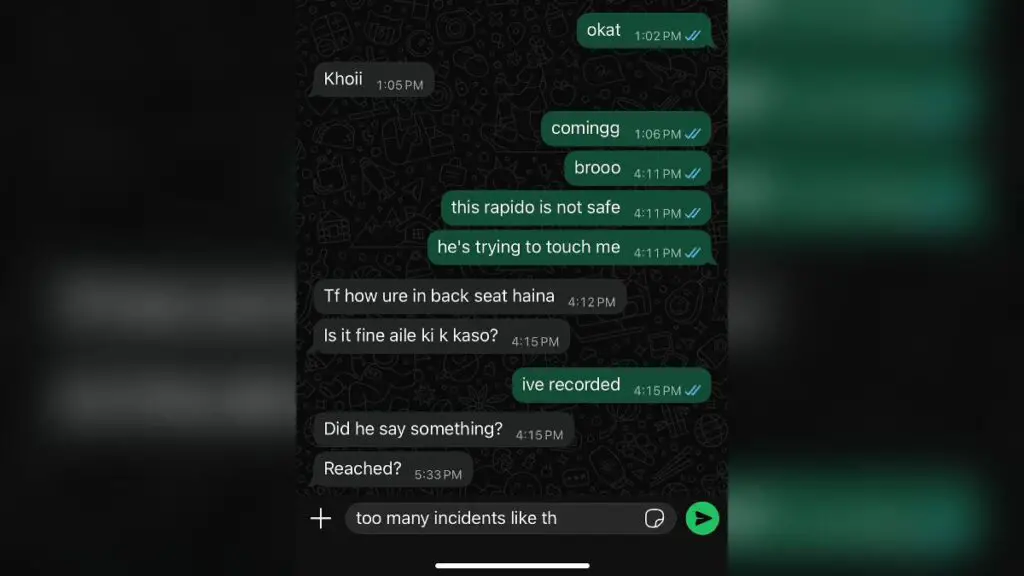 “റാപ്പിഡോ റൈഡുകളിൽ സ്ത്രീകൾ നേരിടുന്ന ഭയാനകമായ അരക്ഷിതാവസ്ഥയുടെ വ്യക്തമായ ഉദാഹരണമാണിത്” എന്ന് യുവതി പ്രതികരിച്ചതായി റിപ്പോർട്ടുകൾ സൂചിപ്പിക്കുന്നു. ബെംഗളൂരു പോലൊരു മെട്രോ നഗരത്തിൽ ഇത് ഒറ്റപ്പെട്ട സംഭവമല്ലെന്നതാണ് ഞെട്ടിക്കുന്ന യാഥാർത്ഥ്യം.